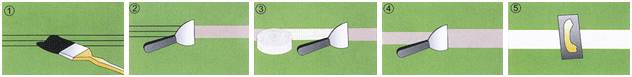 3.在第一步剛完成時(shí)立即抹壓上自粘纖維網(wǎng)帶,并使網(wǎng)帶完全貼在膩?zhàn)由希缓笤诰W(wǎng)帶上薄壓一層膩?zhàn)?/span>