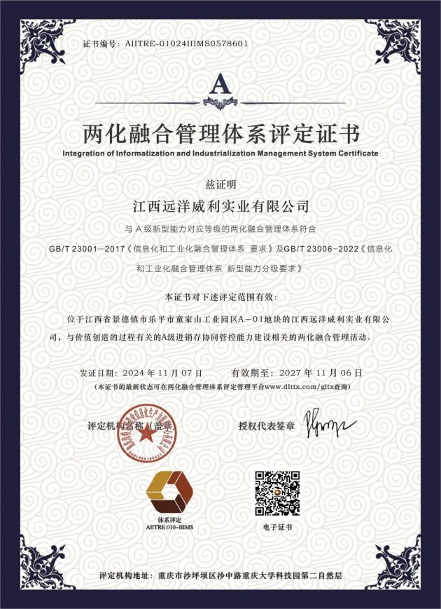Congrats! Ocean Willie through the two integration management system certificationJiangxi Yuanyang Wili Industrial Co., Ltd. passed the national two integration management system certification, the enterprise digital transformation into a new stage. Jiangxi Ocean Wili Industrial Co., Ltd. officially passed the National Ministry of Industry and Information Technology two integration management system certification, won the "two integration management system evaluation Certificate", this certification marks the ocean Wili in the field of informatization and industrialization deep integration has made an important breakthrough, set a new benchmark for the intelligent transformation of the industry. The "integration of the two" is the high integration of informatization and industrialization, which means that informatization drives industrialization, industrialization promotes informatization, and takes a new road of industrialization. Vigorously promoting the integrated development of informatization and industrialization is a long-term and strategic deployment made by the Party Central Committee and The State Council, aiming to comprehensively improve the intelligent level of enterprise research and development, production, management and service through the deep combination of informatization and industrialization. Since the launch of the standardization of the integration of the two, the company's leaders attach great importance to it, to this end, a special working group has been set up to comprehensively optimize ERP, MES and other systems around the construction goal of "intelligent production control ability", covering all stations and processes, to achieve comprehensive digital and intelligent management of the major elements of human, machine, material, method, environment and measurement. Greatly improve the production efficiency and product quality. As a national specialized new small giant enterprise and a national service-oriented manufacturing demonstration enterprise, Ocean Wiley takes "industrial solid waste recycling" as the core, through technological innovation, the use of industrial solid waste to replace high-energy-consuming traditional building materials and raw materials, reduce production energy consumption and pollution, and promote the transformation of the industry to green and low-carbon, and has invested more than 500 million yuan for the digital intelligent transformation of the factory in recent years. The person in charge of the company said that the certification is not only the recognition of technical strength, but also a key step in the strategic transformation of the enterprise, ocean Willi will continue to deepen the integration of information and industrialization, continue to explore innovation, further improve the company's digital and intelligent level, provide customers with better quality products and services, and contribute positive forces to the development of the industry.