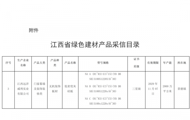 引領綠色建材潮流 | 遠洋威利入選江西省綠色建材產(chǎn)品采信目錄產(chǎn)品近日,江西省工業(yè)與信息化廳發(fā)布江西省綠色建材產(chǎn)品采信目錄的公示,江西遠洋威利實業(yè)有限公司自主研發(fā)的低密度灰硅基層板在無機裝飾板材類入選江西省綠色建材產(chǎn)品采信目錄(三星級),這是低密度灰硅基層板獲得國家級綠色設計產(chǎn)品和國家級綠色建材產(chǎn)品(三星級)之后的又一綠色榮譽。